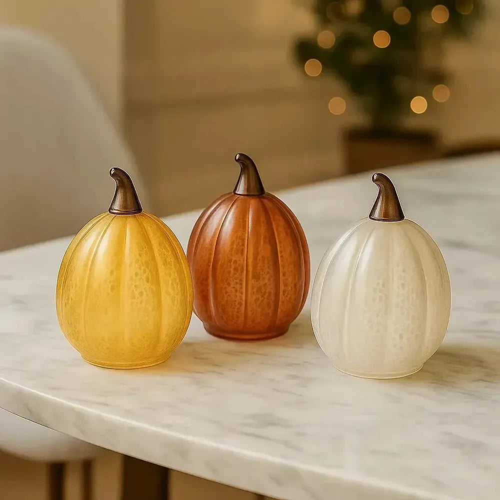 Bring the soft glow of autumn indoors with our set of glass pumpkins. The pumpkins, finished in warm matte glass tones, light up from within with gentle LEDs—perfect for adding a golden touch to your mantle, table, or entryway. Scatter the included tealights alongside for a layered glow that feels cozy and inviting as the evenings draw in.
