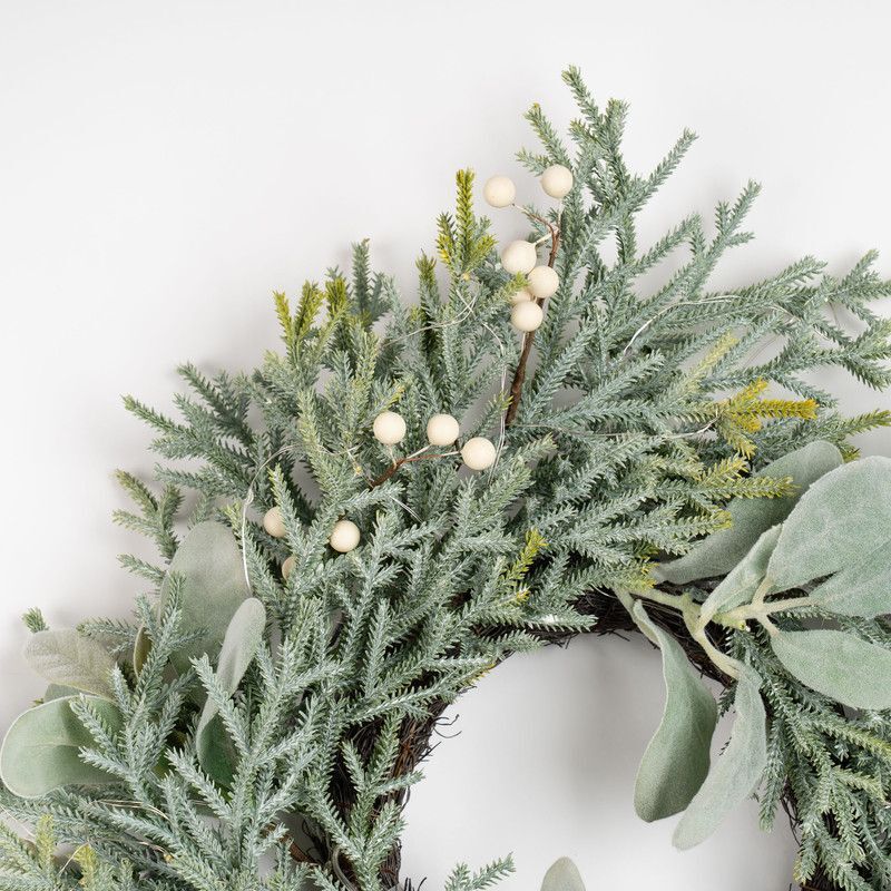 Across cultures, the wreath has stood as a symbol of continuity and seasonal passage, and this 45cm pre-lit frosted wreath carries that lineage into the winter months. Dusted with a delicate snowy finish and softened by lambs ear foliage, it evokes the quiet poise of landscapes at rest. The glow of warm white LED lights turns the wreath into more than a decorative form—it becomes a threshold object, welcoming household and guest alike into a space marked by peace, ritual, and seasonal reflection.
