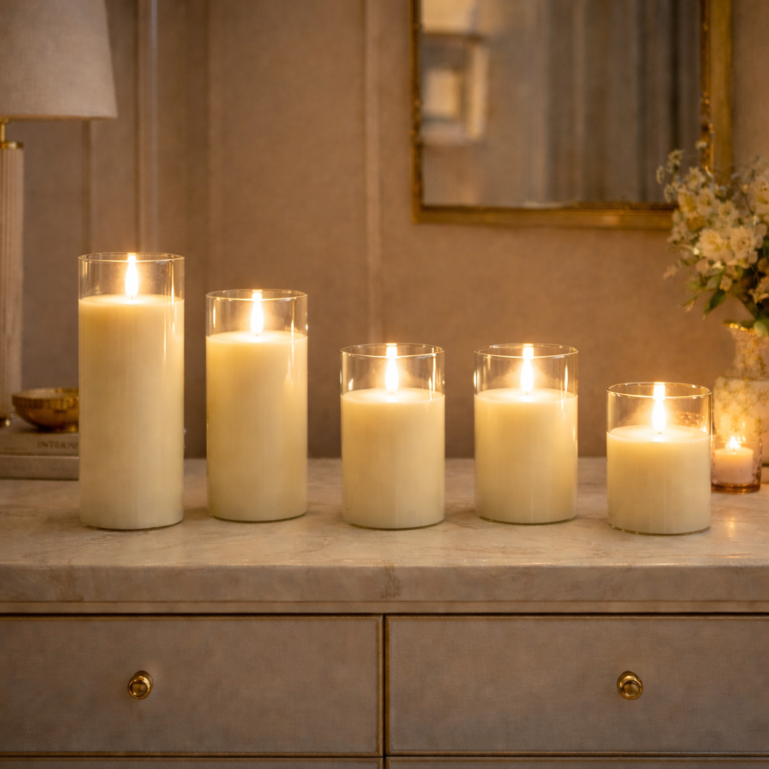 THIS SET CONTAINS x6 CANDLES (x2 OF EACH HEIGHTS: 4", 5" & 7")