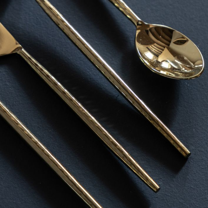 Designed to elevate everyday dining, the Alora 16-piece cutlery set brings refined glamour to the table. Finished in a soft gold tone, each piece features elegantly hammered handles that catch the light, adding subtle texture and a sense of understated luxury.