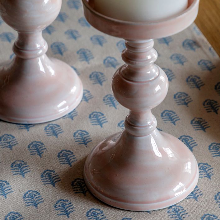 Finished in a smooth pink dipped glaze, the candlesticks add warmth and subtle colour to tables, sideboards, or mantelpieces. Styled together or separately, they offer a simple yet considered way to introduce atmosphere, texture, and gentle sophistication to any room.