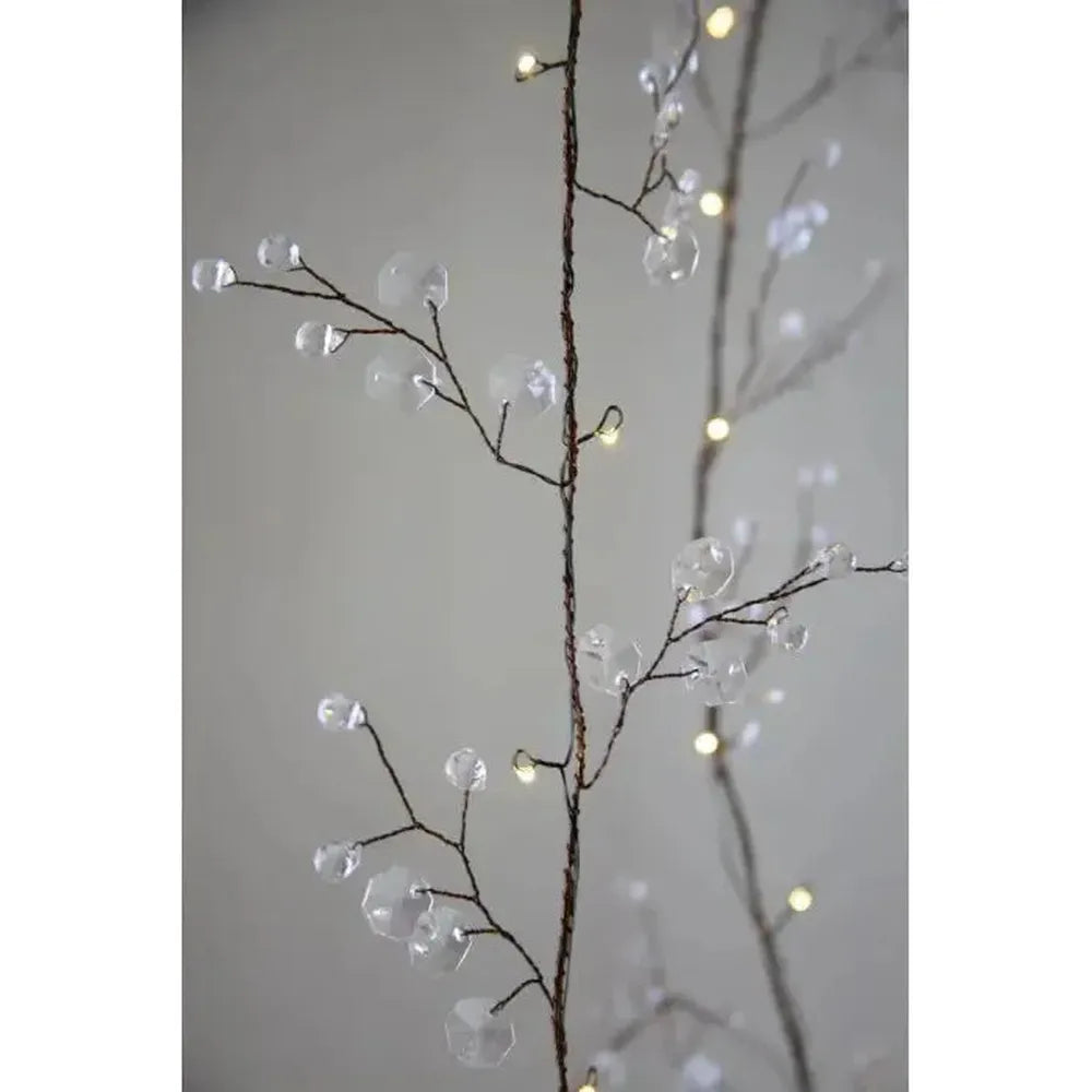 Delicately draped with faceted, crystal-look beads, these enchanting branch lights bring a soft, luminous glow to any space. Each branch is adorned with clear, gem-like droplets, thoughtfully placed to catch and reflect light from every angle. Warm micro-LEDs are woven along slender, hand-wrapped brown stems, creating a layered glow that feels inviting, subtle, and beautifully balanced.