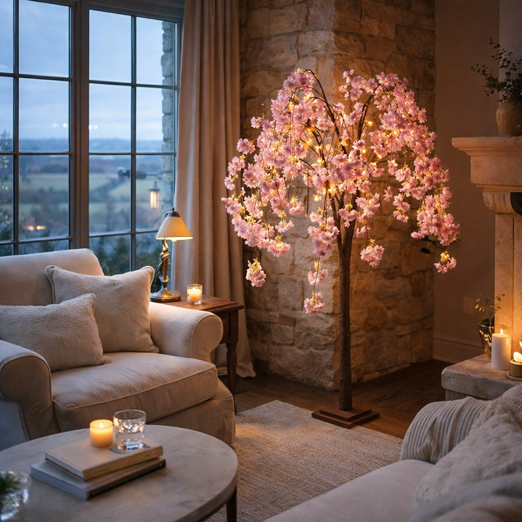 Bringing a sense of fleeting springtime indoors, this illuminated blossom tree captures the quiet poetry of cherry petals in bloom. Cascading branches are delicately dressed with soft pink florals, each one gently lit to create a warm, ambient glow. Standing at 120cm tall, its elegant silhouette feels light and airy, balancing botanical romance with a sculptural presence that elevates it beyond seasonal décor.