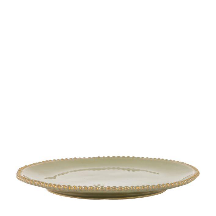 With a high-gloss olive green finish, this set of four side plates adds a touch of richness and character to the table. The soft, organic curves are complemented by a beaded edge trim, bringing subtle texture and decorative interest to the design.