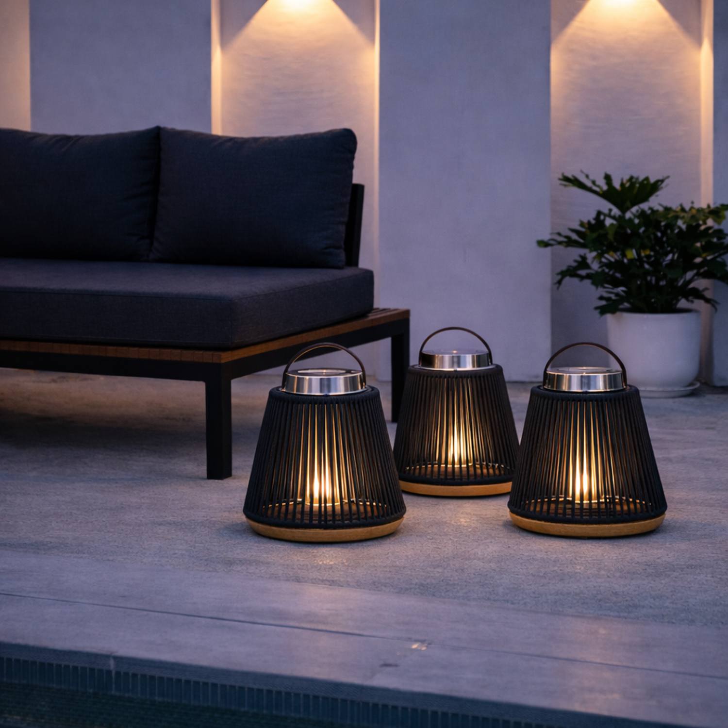 Our Athena Large Solar Light brings a sense of quiet luxury to outdoor living. Designed to glow beautifully from day into dusk, its sculptural silhouette pairs a stainless-steel frame with warm teak accents and woven polyester rope — a thoughtful balance of strength and softness made to live outdoors, season after season.