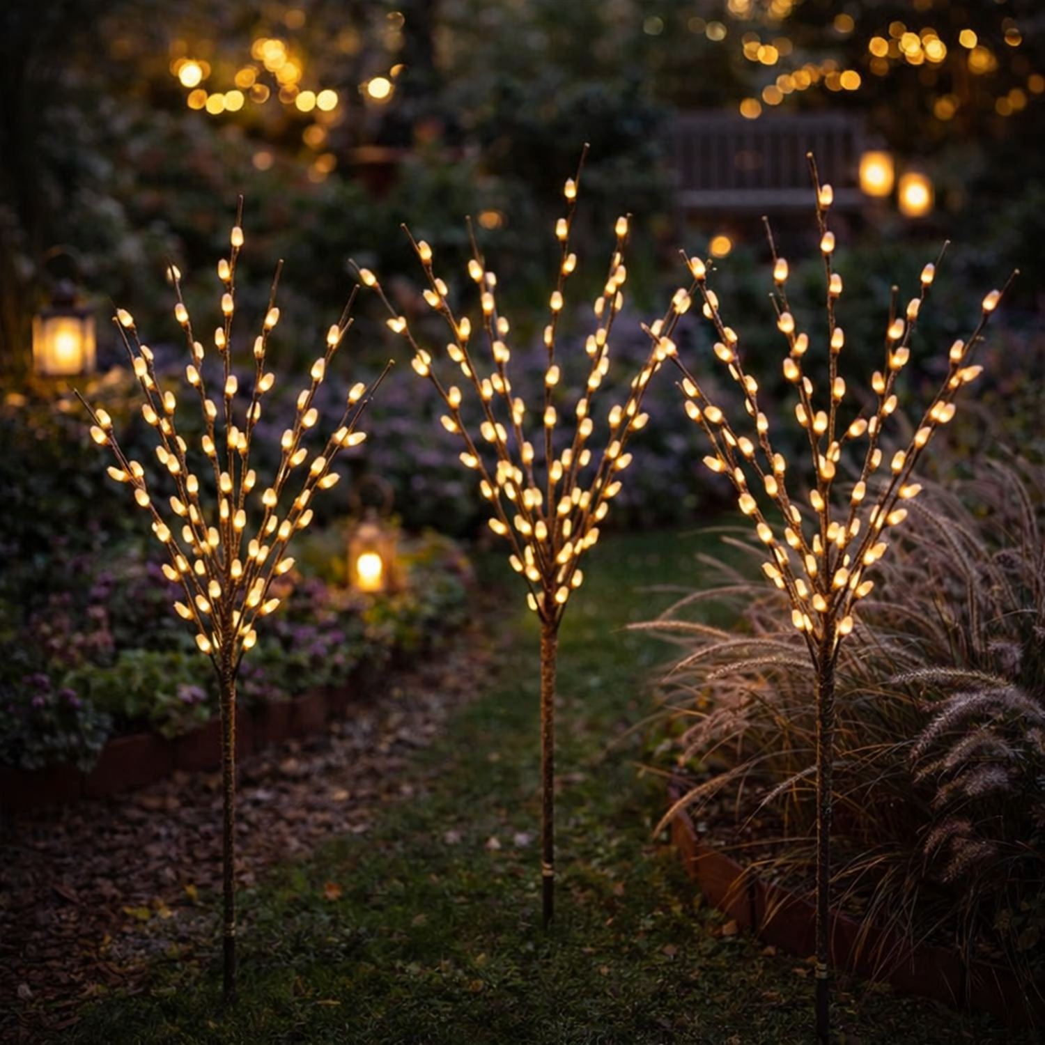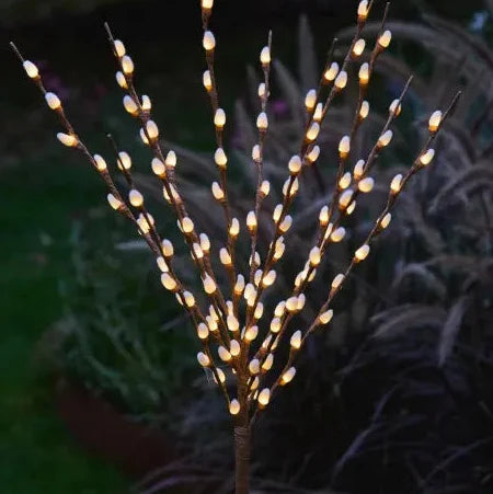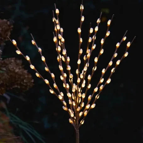 Introducing our premium solar willow lights - a stunning addition to any indoor or outdoor space. These botanical stems boast a fairy tale-like design, featuring 15 warm white LEDs that illuminate the 14 inch diameter buds.