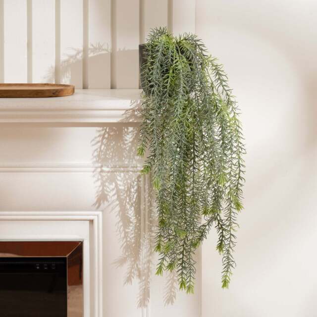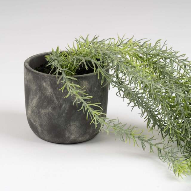 This 43cm artificial trailing plant offers a considered interpretation of nature within the built environment. Its cascading foliage echoes familiar botanical forms, while the cement pot introduces a grounded, utilitarian quality that reflects contemporary tastes for balance between organic softness and industrial materiality.