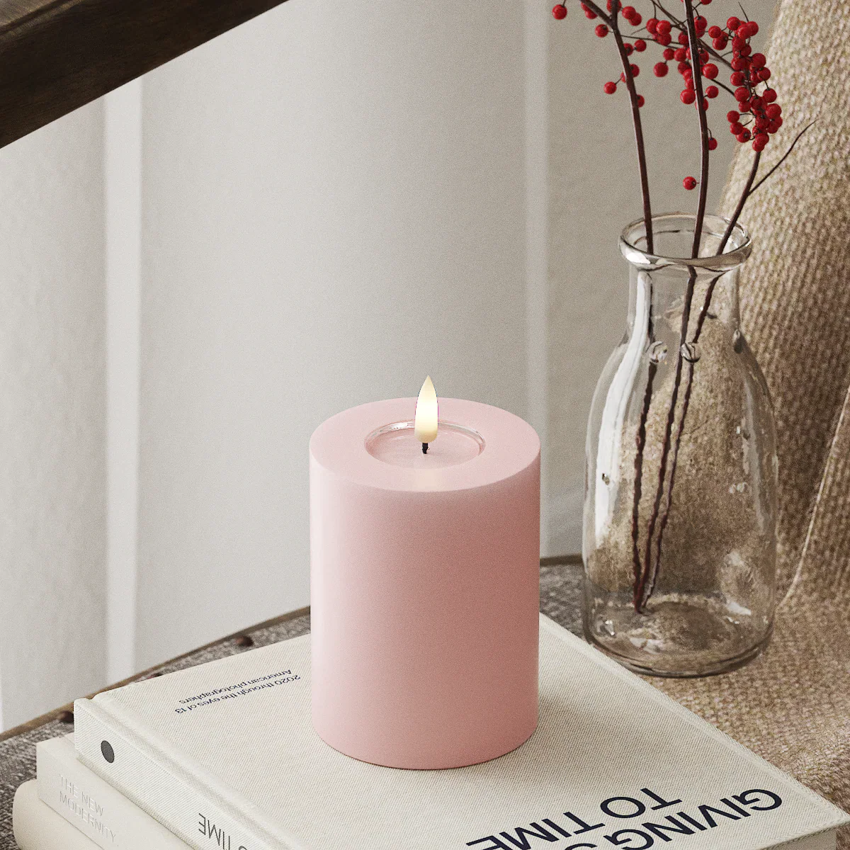 • Warm white LED glow with a soft, natural flicker
