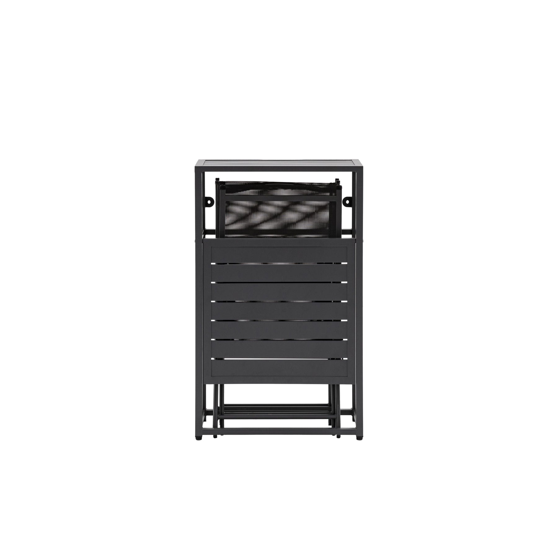 Perfect for balconies this practical and stylish set will let you make the most of your outdoor space no matter how small. With 2 foldable dining chairs and a multilayered foldable dining table providing extra shelf storage and space saving properties all in one this set is a great addition to your balcony. Made from dark grey powder coated steel with a Textilene seat and back on the chairs for extra comfort.